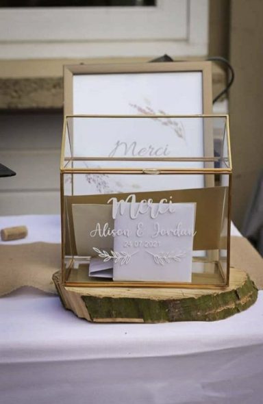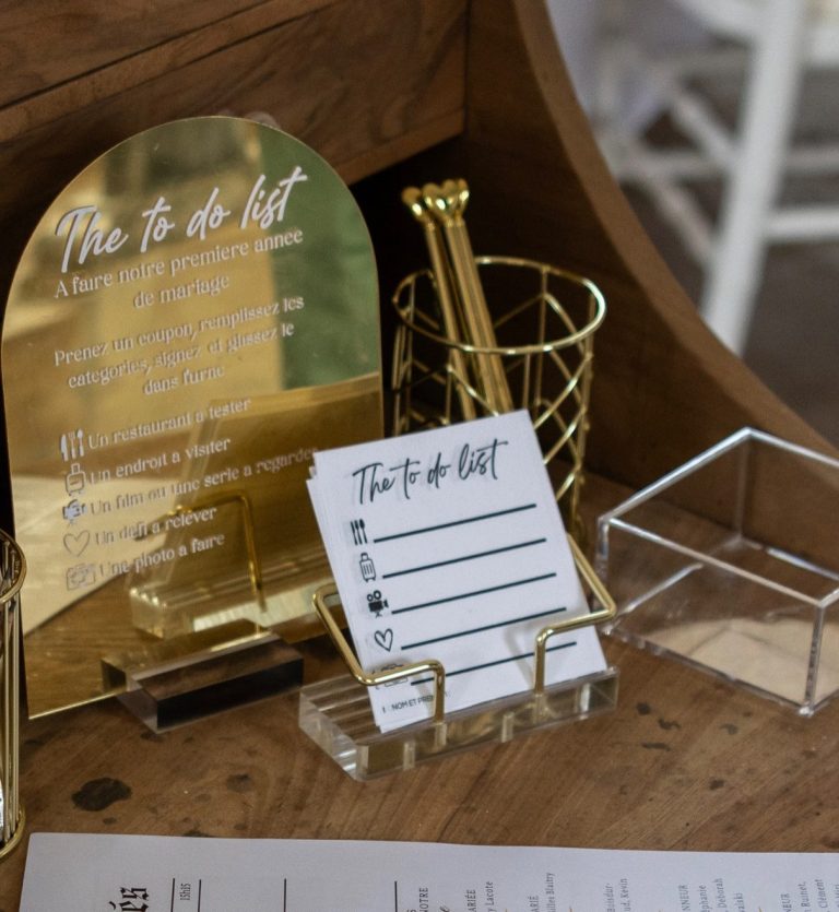 Fourni avec cartons invités, support en métal doré, mini urne transparente + pot à stylo doré